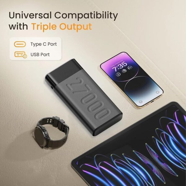 Long-lasting Battery – With a lithium polymer battery of 27000mAh capacity, this powerbank can charge your devices multiple times.